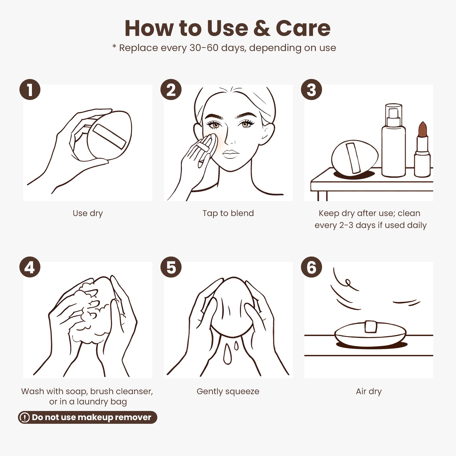 • A: Fully wet the puff, add a small amount of mild cleanser (not makeup remover), gently massage, rinse thoroughly, press out excess water, then air-dry in a cool, ventilated place away from direct sunlight.