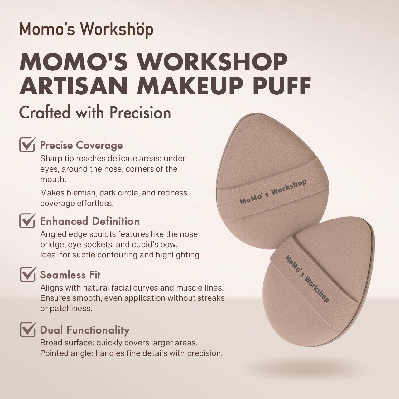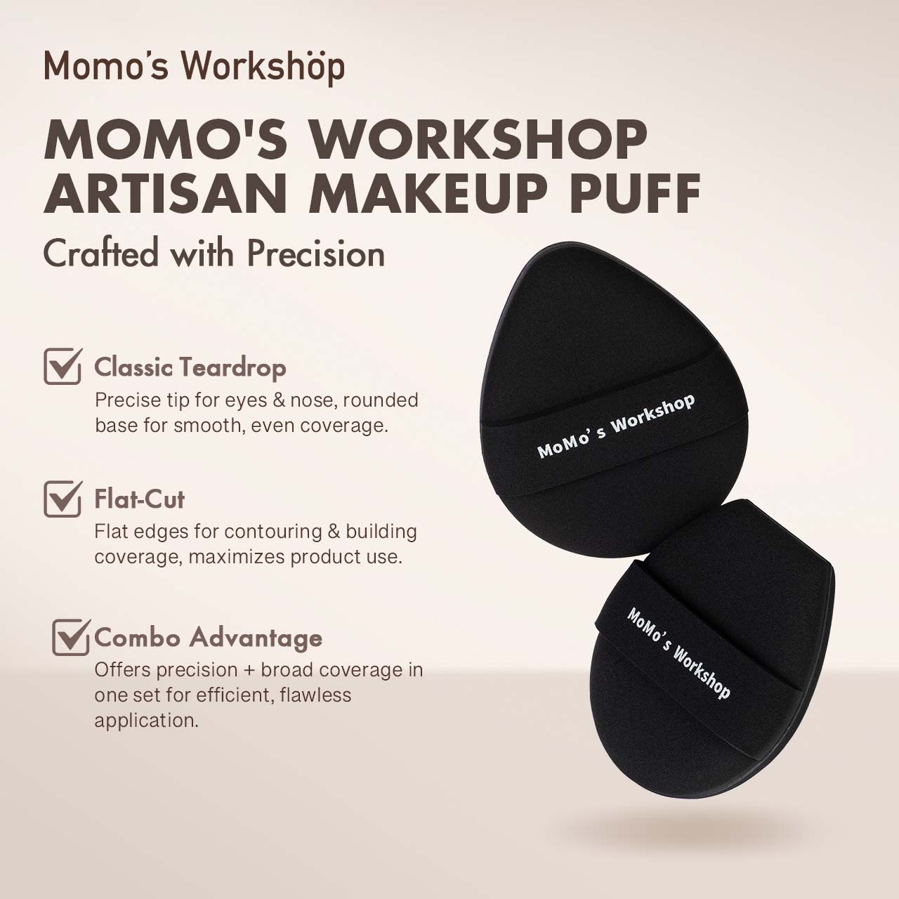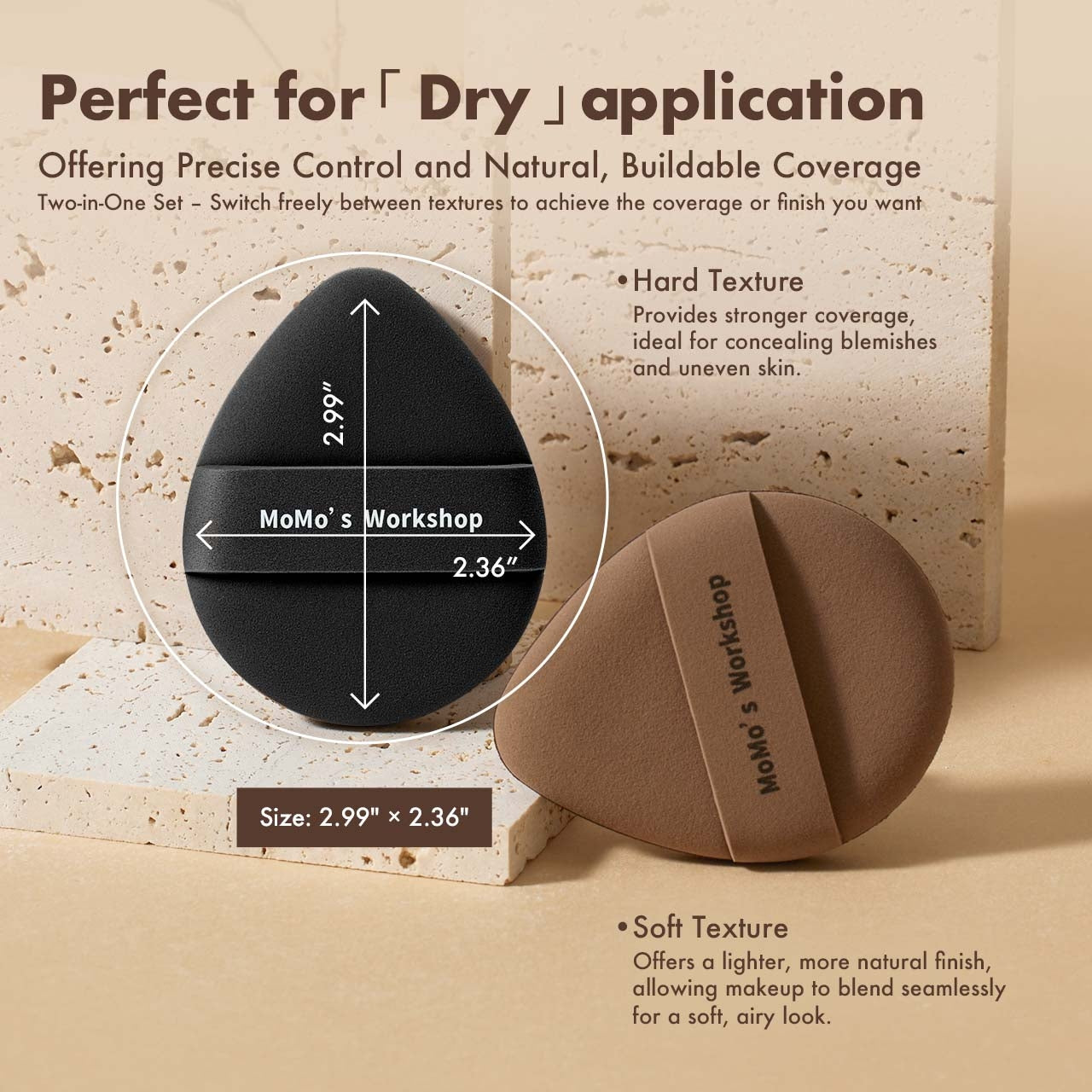 Available in two versatile shapes, the egg-shaped puff fits naturally along facial curves, while the straight-cut puff provides a flat edge for controlled blending under the eyes and around the nose. The dense, resilient surface delivers minimal product absorption, helping you preserve coverage and achieve smooth, even layers.